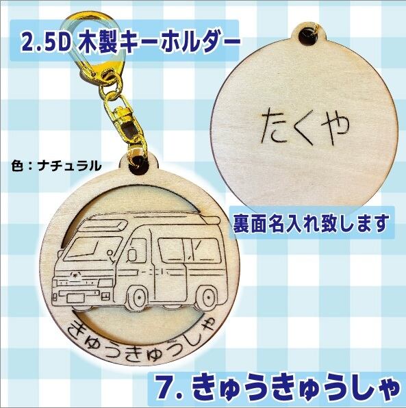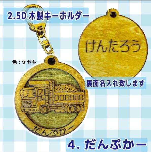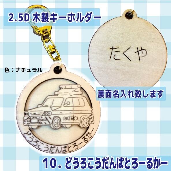 【全10種・名入れ無料】木製 はたらくくるま キーホルダー 立体2層仕立て 50mm 選べる2色(ケヤキ・ナチュラル)パトカー 救急車 ゴミ収集車 ダンプカー レッカー車 バス タクシー 道路公団 乗り物 名前入り 卒園 記念品